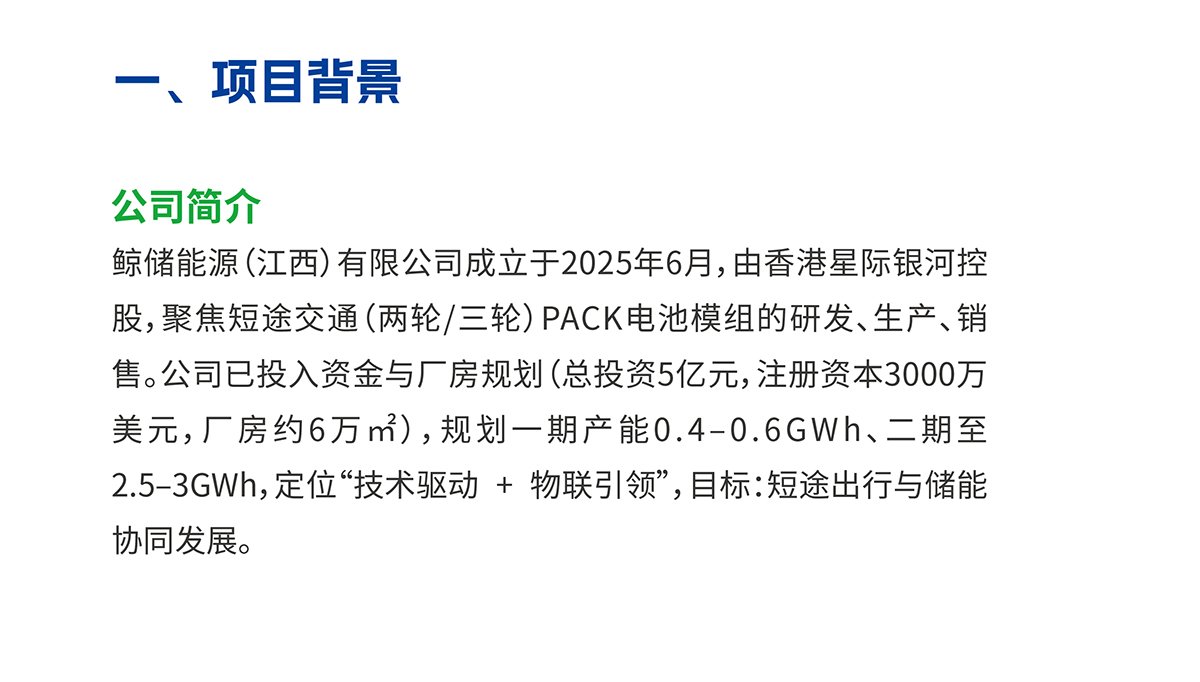 鯨儲(chǔ)能源(江西)有限公司成立于2025年6月,由香港Astral Galaxy Group Limited(星際銀河公司)控股,是一家專(zhuān)注于兩輪電動(dòng)車(chē)、摩托車(chē)及電動(dòng)三輪車(chē)PACK模組電池研發(fā)、生產(chǎn)與供應(yīng)的新興能源企業(yè)。公司以“技術(shù)賦能短途交通能源升級(jí)”為核心定位,致力于為下游整車(chē)廠(chǎng)商、經(jīng)銷(xiāo)商、共享出行平臺(tái)及終端用戶(hù)提供高能效、高安全性和高適配性的智能能源解決方案。